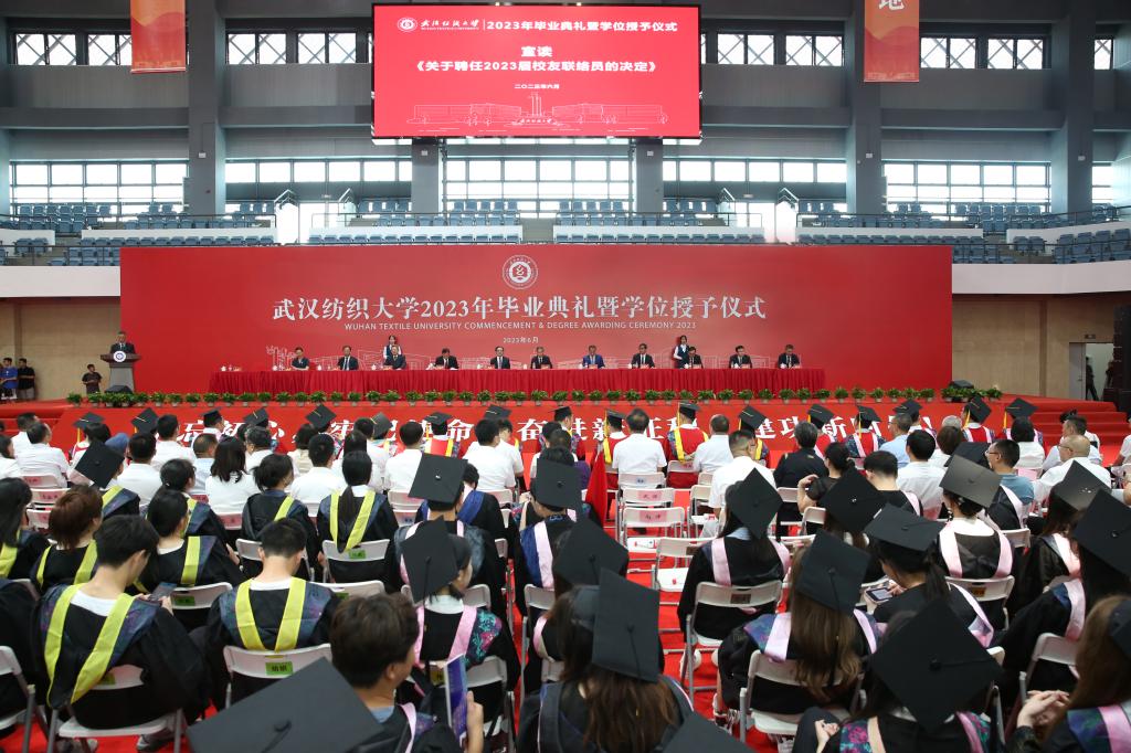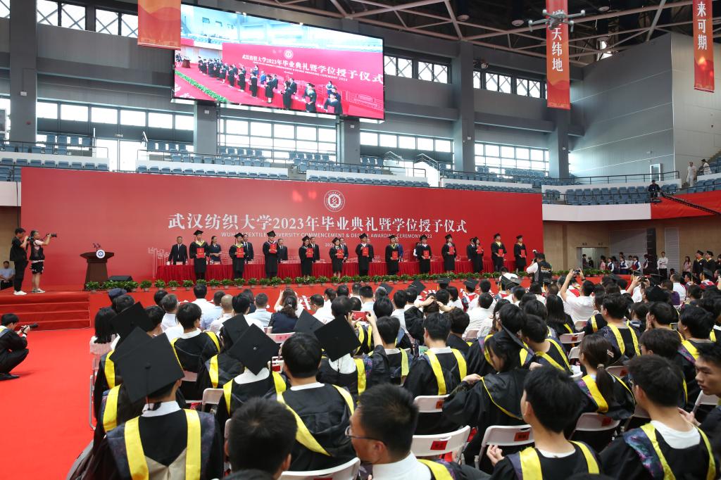 六月蝉鸣起,青衿志可期。6月14日上午,武汉纺织大学2023年毕业典礼暨学位授予仪式在阳光校区体育馆隆重举行。全体校领导,教授、教职工代表,机关职能部门、直属附属单位主要负责人,各院部党政负责人、党委副书记、毕业生辅导员、全体毕业生、校友代表和家长代表共同出席典礼,共同见证2023届毕业生星程起航、逐梦飞扬的荣耀时刻。典礼现场通过学校官方视频号、抖音等新媒体平台进行了同步直播。